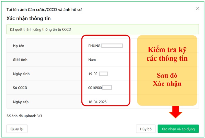 Sau khi hệ thống quét QR code từ ảnh thẻ Căn cước thành công, hệ thống sẽ tự động nhập các thông tin thí sinh tương ứng bao gồm: Họ và tên; Giới tính; Ngày sinh; Số căn cước, Ngày cấp. Thí sinh cần kiểm tra kỹ, ấn xác nhận và áp dụng.