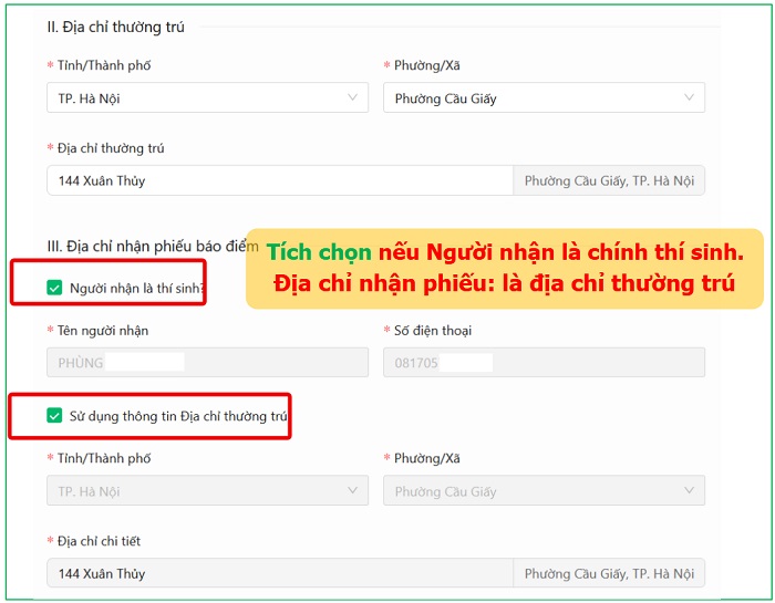 Lưu ý: trường hợp thông tin Người nhận phiếu báo điểm chính là thí sinh thì tích chọn mục: Người nhận là thí sinh. Tương tự với mục Địa chỉ nhận phiếu báo điểm.