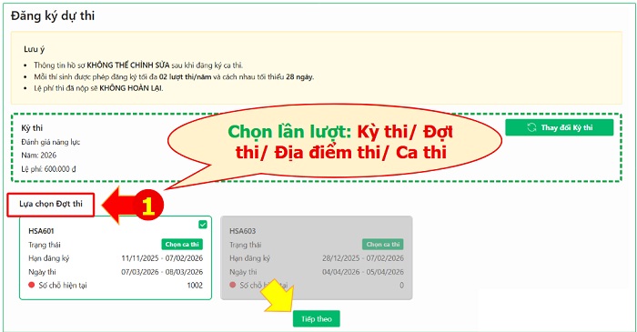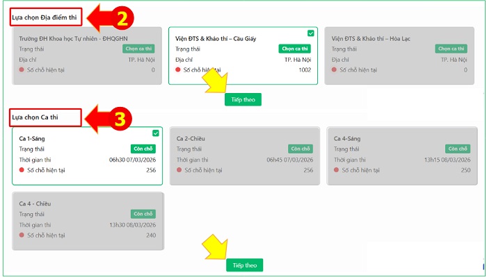 Lần lượt chọn Kỳ thi, Đợt thi, Địa điểm thi, Ca thi. Thí sinh được chọn 2 ca thi/năm; thời gian giữa 2 ca thi (gồm cả ngày thi) cách nhau tối thiểu 28 ngày. Các ca thi đã đủ số lượng thí sinh đăng ký (hết chỗ) sẽ ở dạng không hoạt động và có thông báo Hết chỗ .
