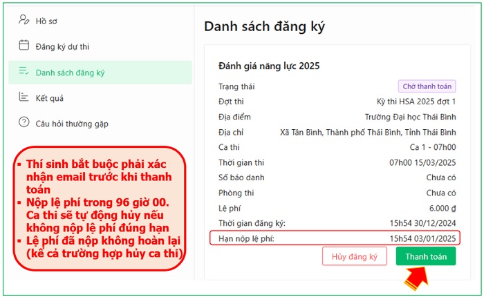 Hệ thống https://hsa.edu.vn/ sẽ tự động gửi email cho thí sinh thông báo việc đăng ký ca thi thành công. Thí sinh phải nộp lệ phí sau 1 giờ 00 và trước 96 giờ 00 kể từ khi chọn ca thi thành công. Nếu không hoàn thành việc nộp lệ phí đúng thời hạn 96 giờ 00 phút, hệ thống sẽ tự động hủy ca thi và gửi email thông báo cho thí sinh. Lệ phí đã nộp không hoàn trả. Thí sinh cân nhắc kỹ trước khi chọn Thanh toán .