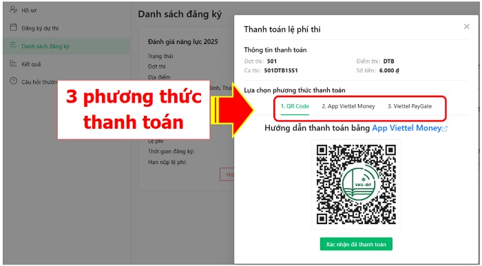 Ngay sau khi chọn Thanh toán , màn hình hiện ra 3 phương thức thanh toán: Apps Viettel, quét QR Code Viettel Money, Cổng thanh toán. Thí sinh cần phải đảm bảo tài khoản giao dịch ngân hàng của bạn đảm bảo đủ lệ phí theo quy định (bao gồm cả phí giao dịch nếu có) trước khi thực hiện thanh toán để tránh thất bại khi nộp lệ phí ca thi.