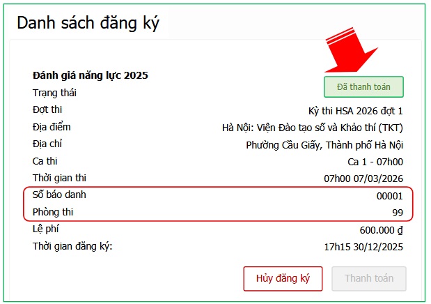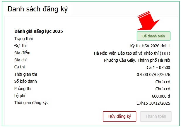 Sau khi hoàn thành việc nộp phí đăng ký dự thi, thí sinh nhận được email thông báo xác nhận trạng thái thanh toán lệ phí thi trong 24 giờ, nếu không có email trong Hòm thư (Inbox), có thể kiểm tra trong mục Thư rác (Spam) của bạn. Trong trường hợp chưa nhận được email, thí sinh truy cập Hệ thống để kiểm tra việc xác nhận chuyển trạng thái Đã thanh toán ca thi.