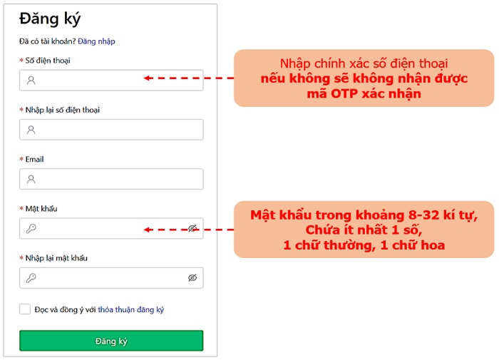 Thí sinh nhập chính xác số điện thoại đăng ký để nhận mã OTP xác thực tài khoản. Số điện thoại là duy nhất và không thể thay đổi.