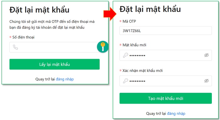 Trường hợp quên mật khẩu chọn Đặt lại mật khẩu , điền số điện thoại mà bạn đã đăng ký để thực hiện thao tác tiếp theo. Hệ thống sẽ gửi một mã OTP đến số điện thoại mà bạn đã đăng ký tài khoản để đặt lại mật khẩu.